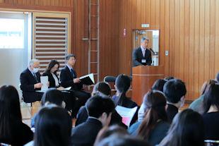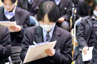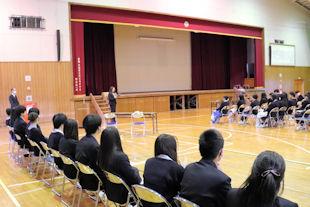この日は、同窓会長代理の方から3年次生へ入会歓迎の言葉が贈られるとともに、卒業記念品(卒業証書ホルダー)の目録が年次代表幹事生徒に渡されました。