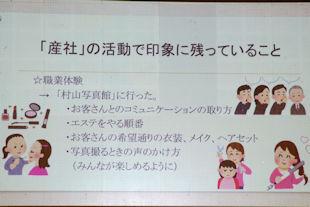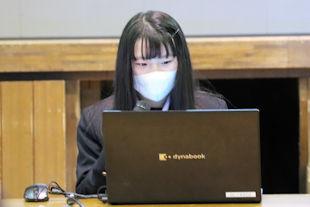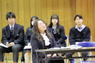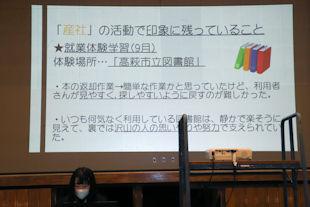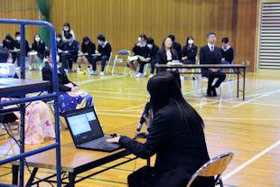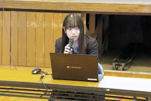 この日は、前週のクラス発表会で選ばれた各クラスの代表者が、「今の私そして、これからの私」をテーマに、「産社の活動で印象に残っていること」や「将来の夢」、そして、その夢の実現のために今後の高校生活をどう過ごすかなどについて発表を行いました。