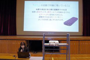 この日は、高萩市役所危機対策課から担当者の方にご来校いただき、防災の心構えなどについてお話しいただいた後、グループに分かれて、間仕切りテントや段ボールベッド、防災用簡易エアーベッドの設置体験をしました。