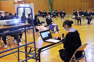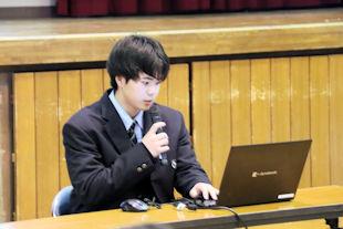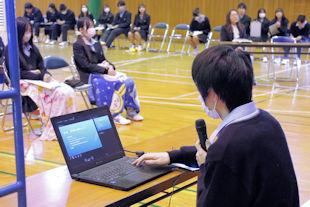 現生徒会長からの活動成果報告に続いて立会演説会が行われ、立候補者と応援弁士が、任期中に行ってみたいことや推薦理由などについて演説し、投票を求めました。