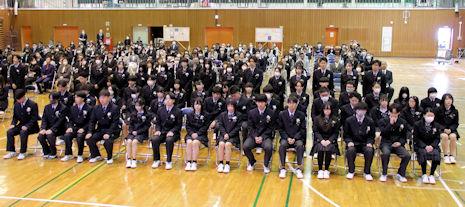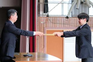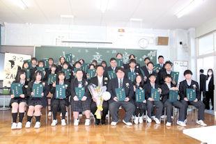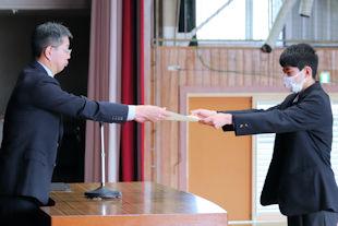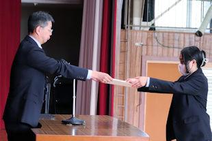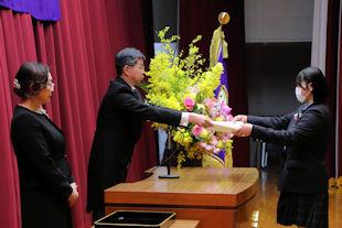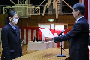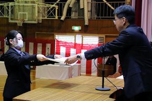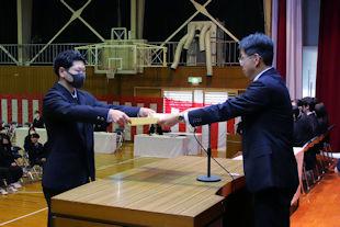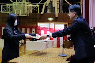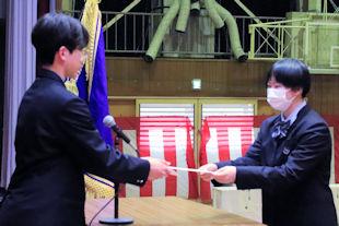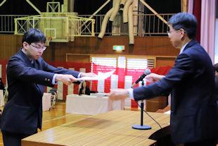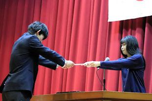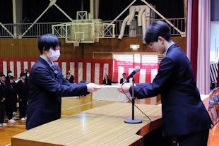 最後に、生徒会長から3年次の代表生徒に「卒業記念品」の目録が渡されました。