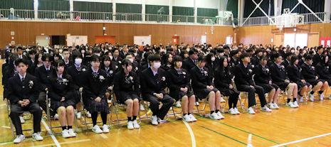 全校生徒が体育館で一堂に会し、対面式を実施し、生徒会長から新入生に歓迎の言葉が贈られるとともに、新入生代表の生徒があいさつの言葉を述べました。