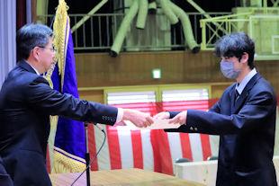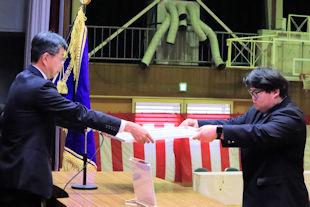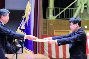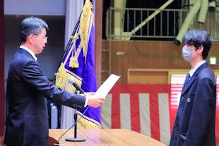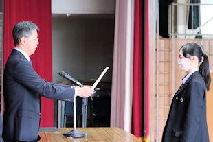 集会に先立って、表彰伝達式が行われ、基礎製図検定の合格者や読書感想文の入選者、部活動で顕著な成績を残した生徒たちに校長先生から賞状が伝達されました。